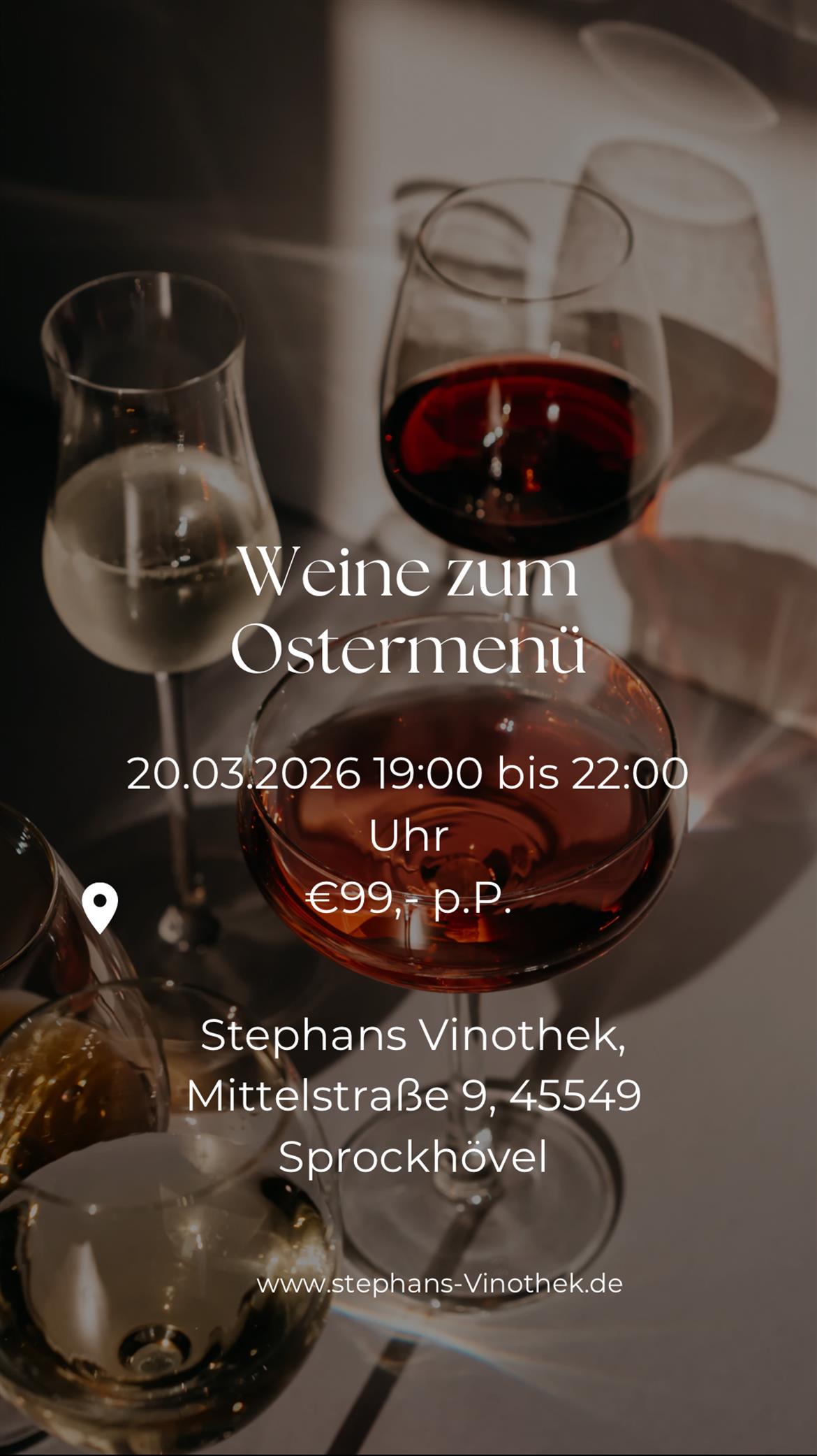 Begrüßt werden Sie mit einem Glas Schaumwein. Danach präsentieren wir Ihnen 5 tolle Weine, die perfekt zu dem typischen Ostergerichten passen. Begleitet werden die Weine von einem 3-Gänge-Menü.